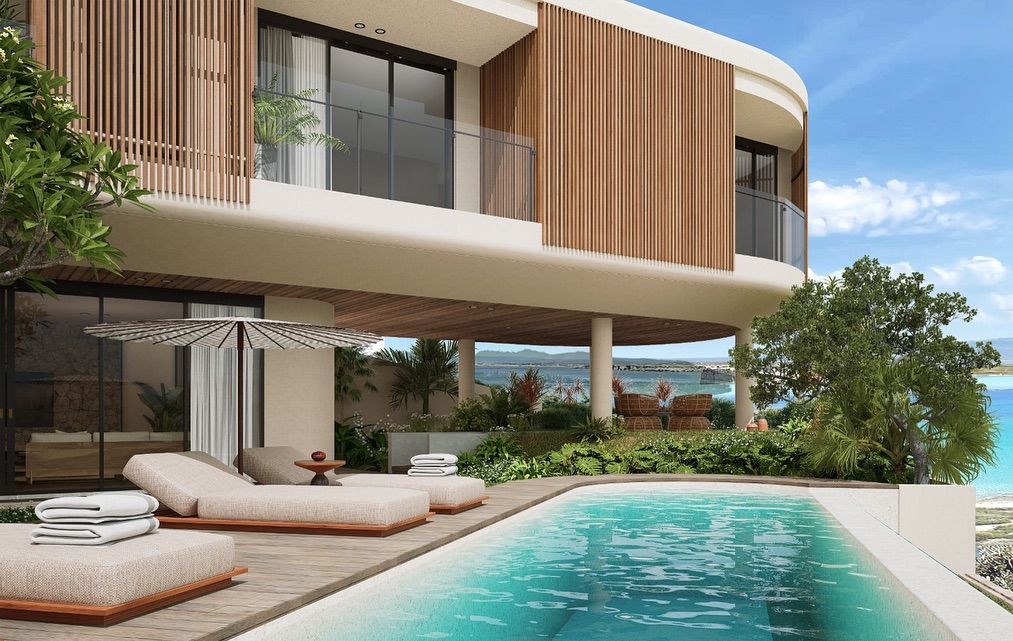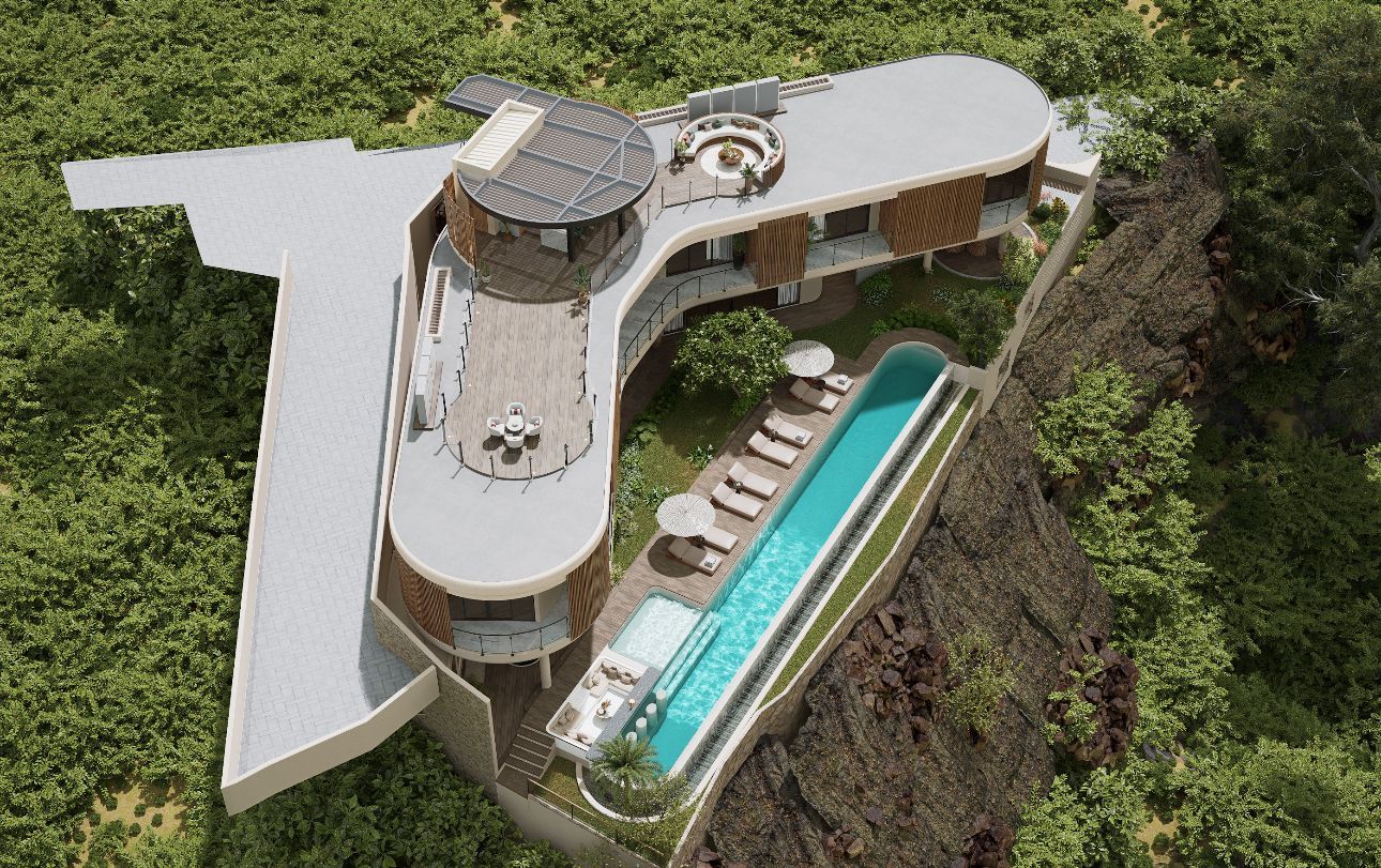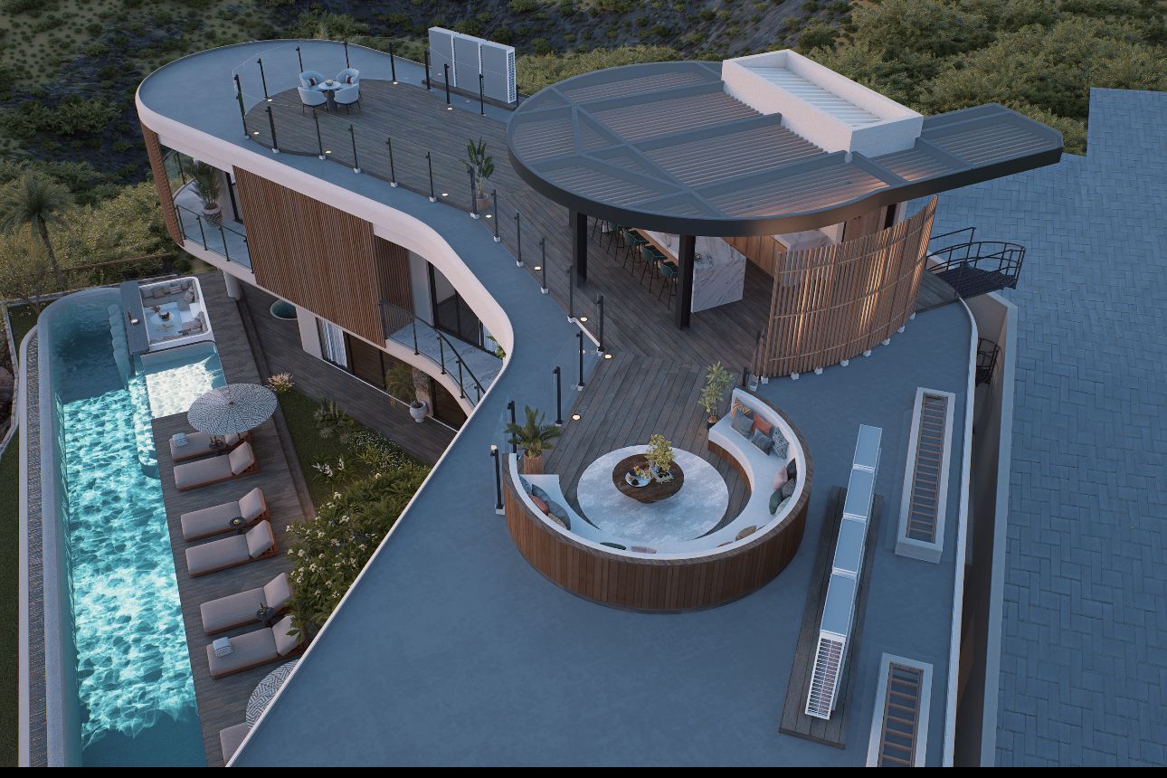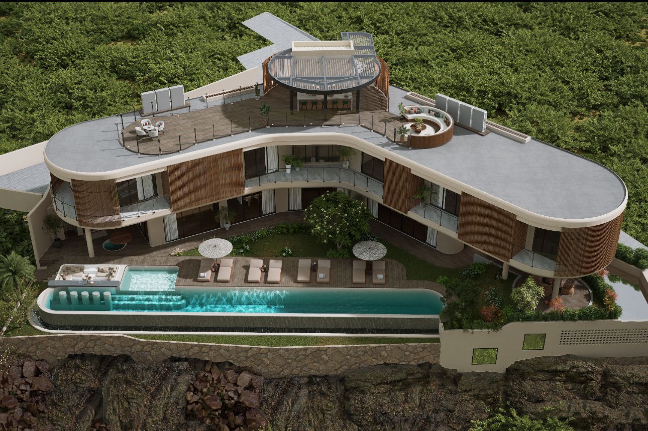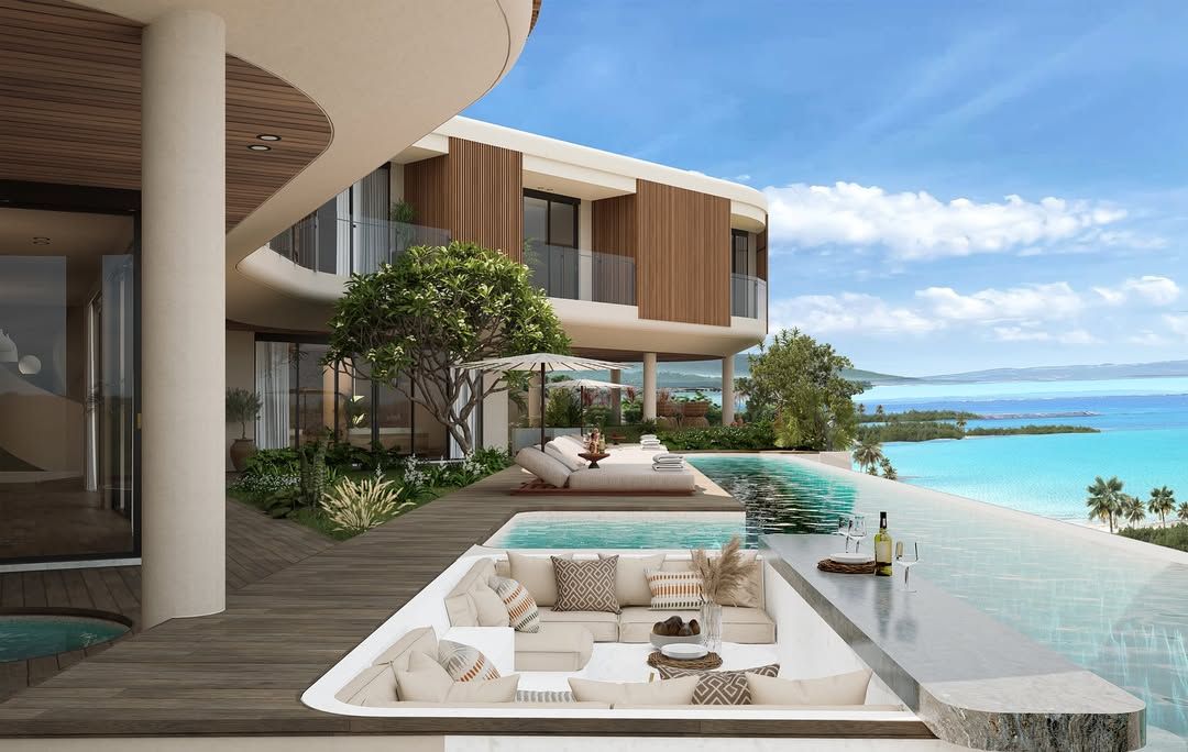The house features a 25m infinity lap pool with an outdoor sunken lounge and bar, offering in-pool seating and stunning sea views. There’s direct beach access via a private staircase and a covered outdoor seating area not visible in the pictures but shown on the floor plans, located to the right of the pool under the house's overhang.