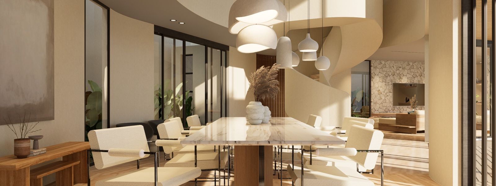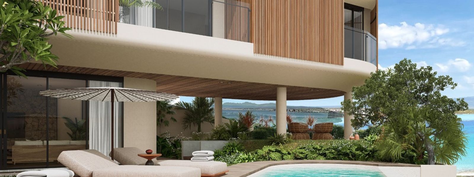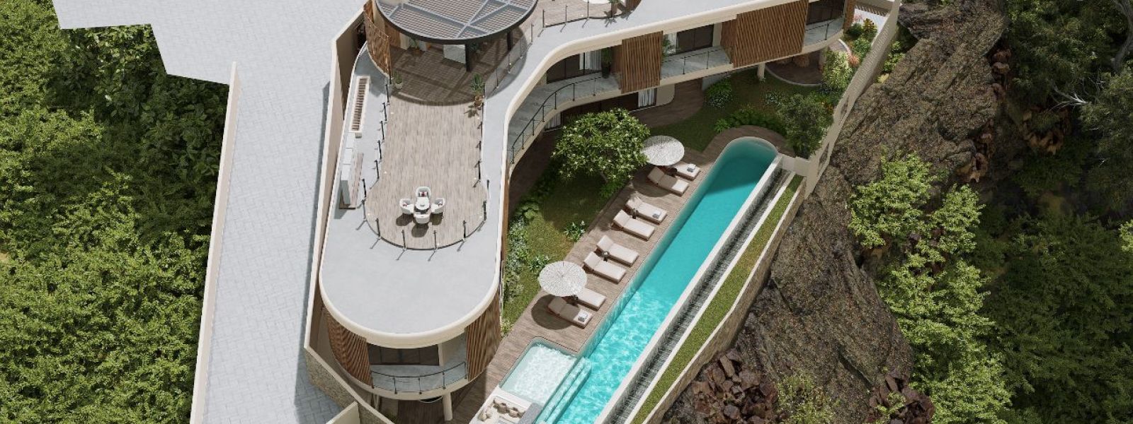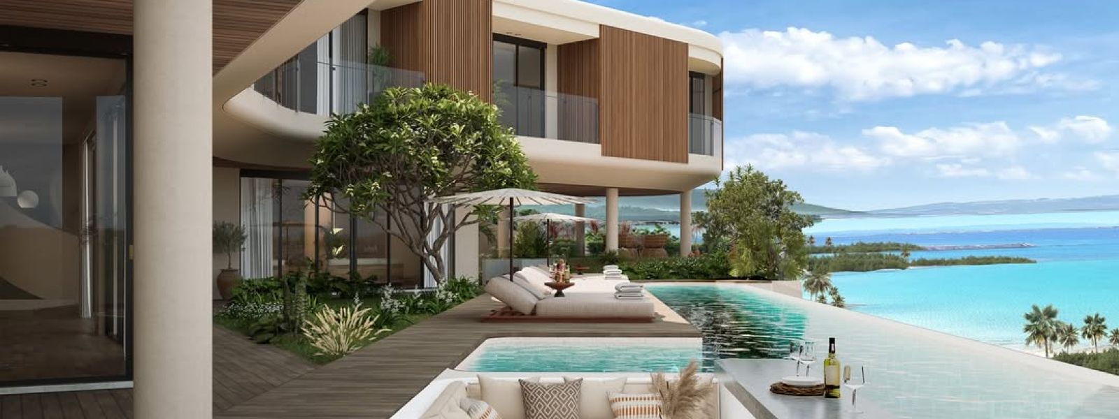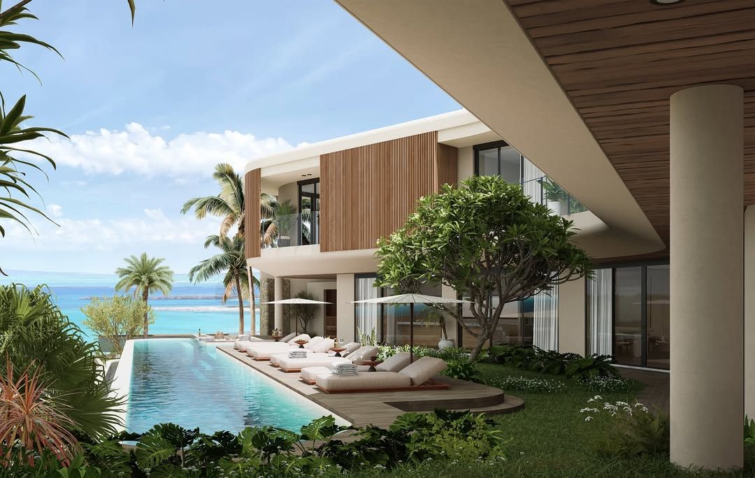 The house features a 25m infinity lap pool with an outdoor sunken lounge and bar, offering in-pool seating and stunning sea views. There’s direct beach access via a private staircase and a covered outdoor seating area not visible in the pictures but shown on the floor plans, located to the right of the pool under the house's overhang.