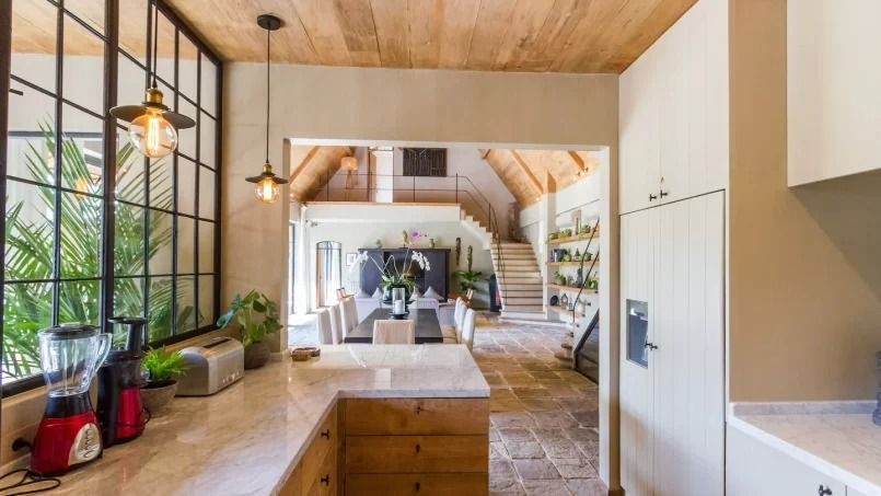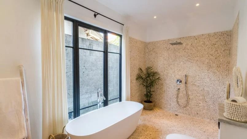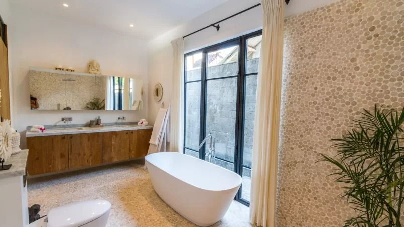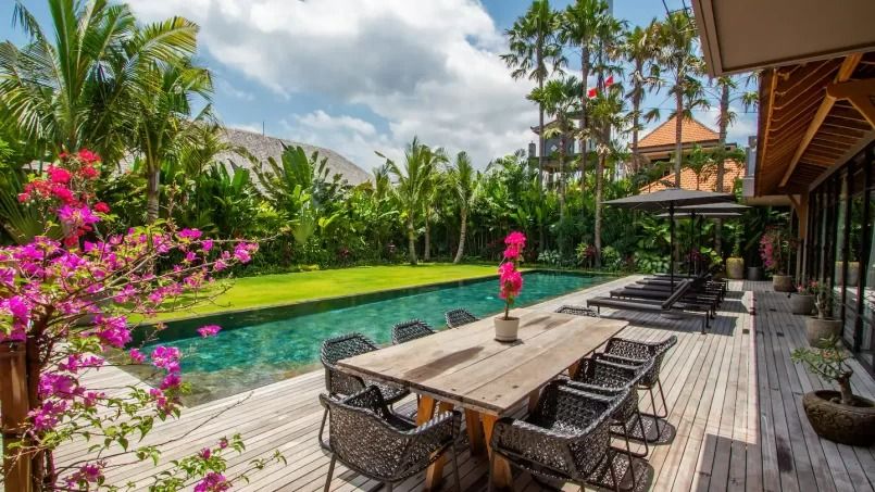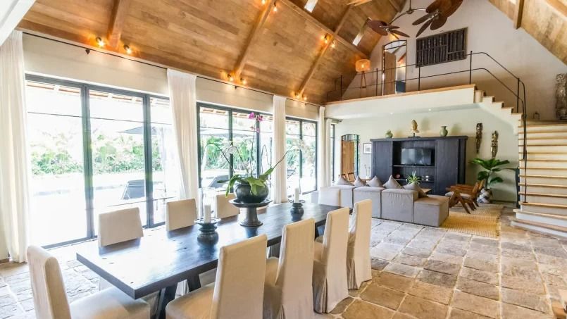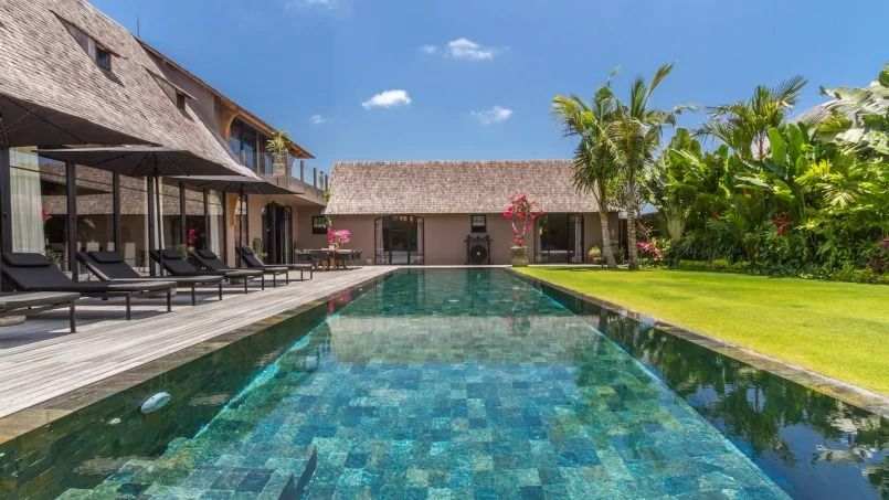 Indulge in the captivating experience of tropical serenity and refined Tuscan aesthetics within this opulent villa. Crafted with meticulous attention to detail, this magnificent residence boasts two pavilions with shingle roofs, overlooking a resplendent 20 meter lap pool surrounded by lush green foliage. Immerse yourself in the spacious living areas adorned with cobblestone floors and soaring ceilings, reminiscent of a rustic Tuscan estate. The five enchanting bedrooms offer serene havens, decorated with natural tones and adorned with timeless furnishings. Nestled away from the usual tourist trails, this exquisite property is conveniently located just a short drive from the trendy enclaves of Seminyak and Canggu.