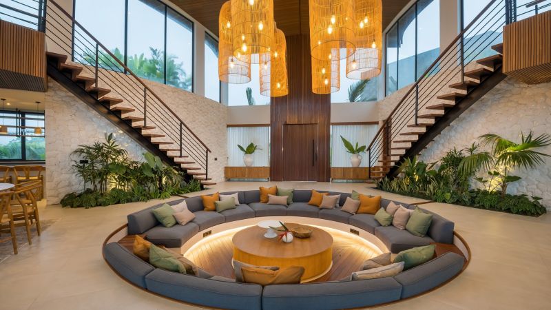 What makes this apartment so special are the gorgeous textures that give it a peaceful and elegant vibe. By using materials like wood, stone, and natural fibers, the rooms come to life with a sense of vitality. The living area brings tranquility and a connection to nature, crucial in today's fast-paced world. This modern decor strikes a perfect balance and gives off a polished yet down-to-earth aesthetic.