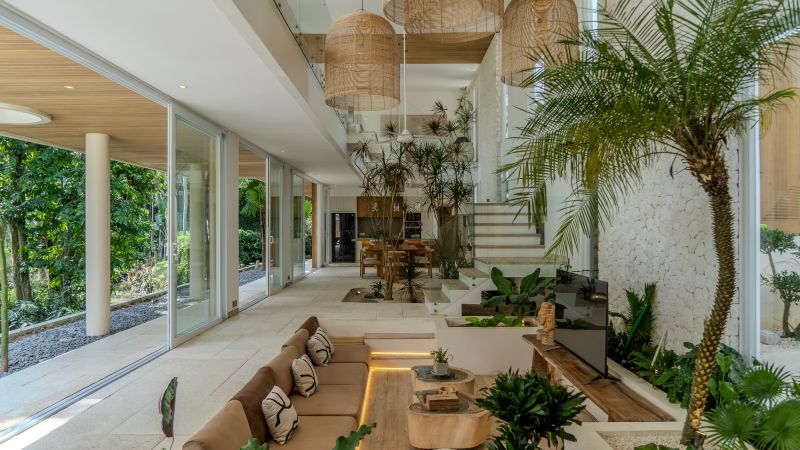 This fully equipped and furnished two-story villa offers comfort and convenience. It blends modern architecture with tropical and Scandinavian influences, creating a perfectly balanced design. The open dining and family room features wide glass doors, providing a spacious feel while maintaining privacy.